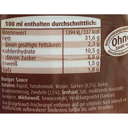 Herrlich fruchtig würzige Burger Sauce, Mit feinen Gurken- und Zwiebelstückchen, Ohne Konservierungsstoffe und ohne Zusatz von Geschmacksverstärkern, Passt perfekt zu Burgern und Sandwiches
