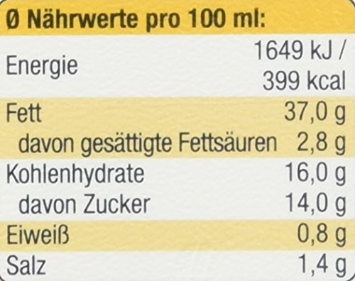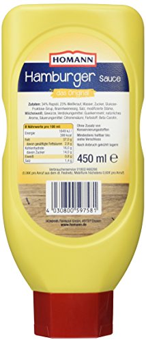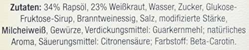 Inhaltsstoffe / Zutaten: Zutaten:34% Rapsöl, 23% Weißkraut, Wasser, Zucker, Glukose-Fruktose-Sirup, Branntweinessig, Salz, modifizierte Stärke, MILCHEIWEIß,Gewürze, Verdickungsmittel: Guarkernmehl; natürliches Aroma, Säuerungsmittel Citronensäure; Farbstoff: Beta-Carotin.; 1.1. Anschrift Hersteller/Importeur: 49197 Dissen, www.homann.de;