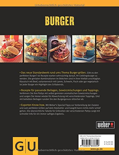 Dieses Buch macht Sie zum König der Burger! Der Werbespot eines amerikanischen Massen-Burger-Herstellers suggeriert uns: 'Geschmack ist King'. Fatal an der ganzen Sache ist, dass die Definition von Geschmack leider streitbar ist. Den besten Geschmack beim Zubereiten von Burgern erreichen Sie durch ausgewählte Zutaten, bestes Fleisch, erlesen Gewürze und eine sorgfältige, liebevolle und bewusste Arbeit. Sie haben keinen Schimmer was Sie brauchen, wie Sie's verarbeiten müssen und worauf es genau ankommt? Das Buch 'Weber's Burger – Die Besten Grillrezepte hilft Ihnen und gibt so manche Anregung rund um die beliebtesten Fleischfladen der Welt. Bereiten Sie selber zu Hause am Grill beste Burger zu und machen Sie aus einem ordinaären Grillen im Kreise der Familie und Freunde einen klassischen, amerikanischen Burger-Abend ganz nach Ihrem Gusto. Mit dem Buch 'Weber's Burger – Die Besten Grillrezepte' sind Sie bestens vorbereitet und machen aus Ihrem Garten einen original amerikanischen Burger-Laden